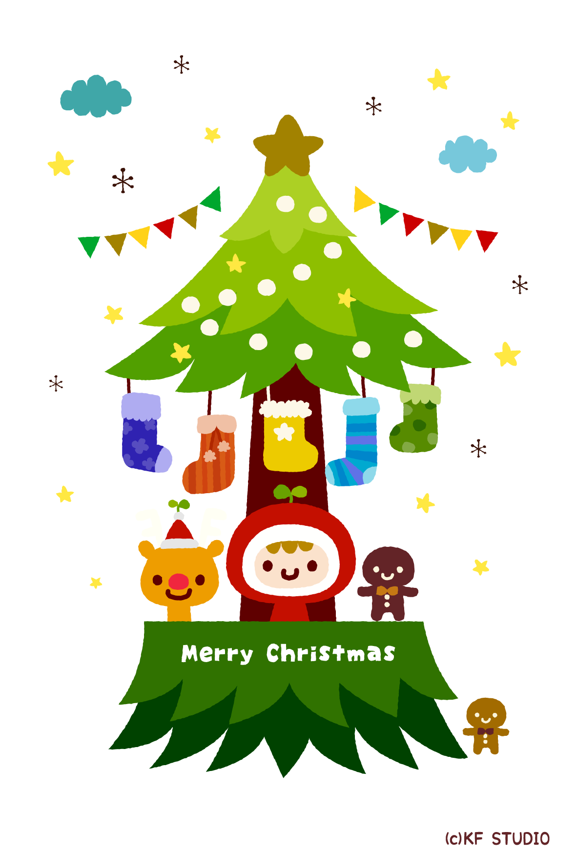 クリスマスツリーにたくさん靴下をぶらさげたクリスマスカードです。